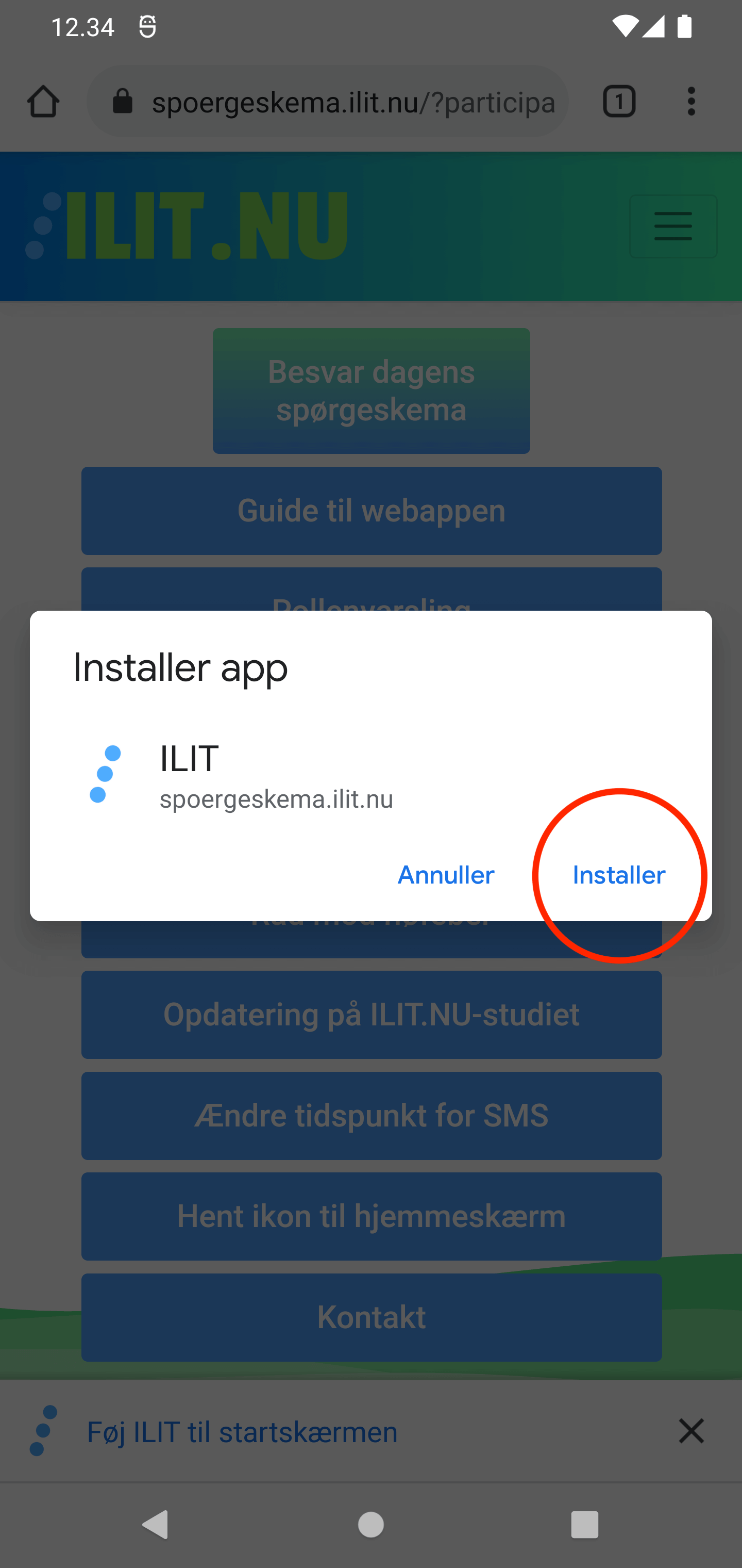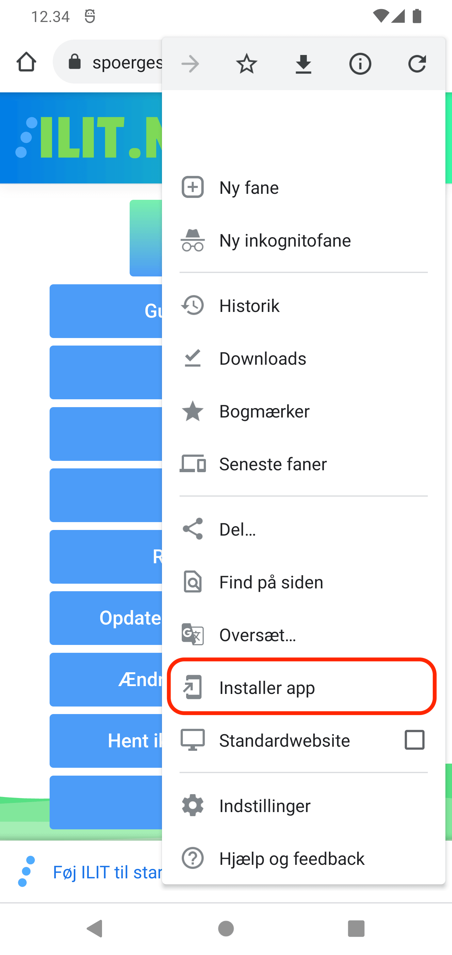 Tryk 'Installer app' i menu.